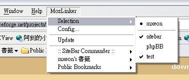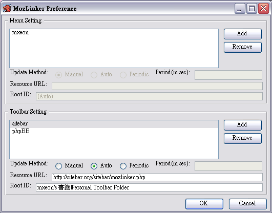 Note: Although the ID appears as mxeon's bookmark|Personal Toolbar Folder in the RDF generated by mozlinker.php, you should input the ' as '. That is what you see in the Sitebar.